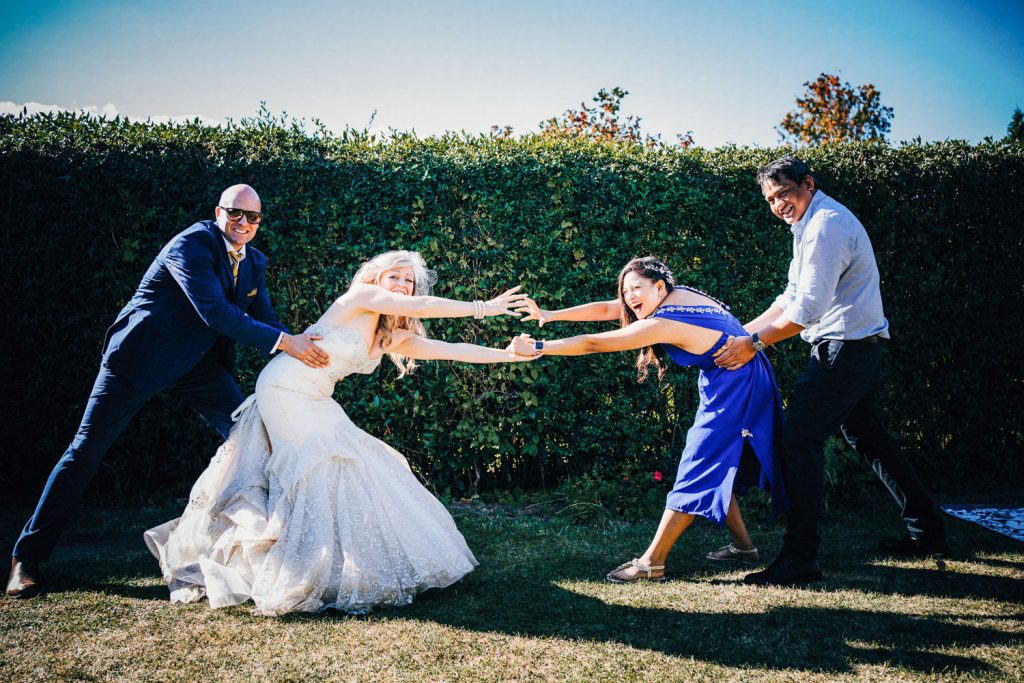 Du kan også bruge den klassiske “twill-spin”: Sig til gommen, at han skal snurre bruden rundt i en dans, det giver flot bevægelse i kjolen og genuine smil . Et andet trick: “Lad som om I er på jeres allerførste date – gå tæt sammen og hvisk noget.” De vil måske fnise, men det løsner dem op.